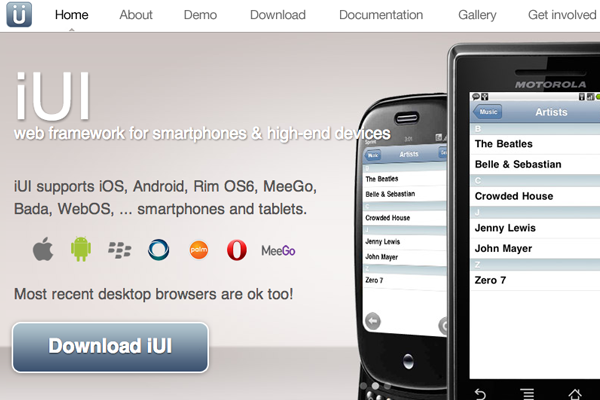 Another framework you’ll want to remember is called iUI, specifically geared towards mobile websites and webapps. These components are built to match so you can design interfaces for iOS, Android, Blackberry, really anything you’d like. iUI is quite advanced with multi-column navigation and more detailed JavaScript effects.