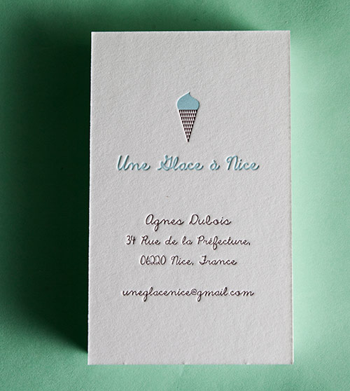 This cute ice cream business card was generated with seven colors of letterpress. The color in the design is the result of immense details and pulls of a great retro look.
